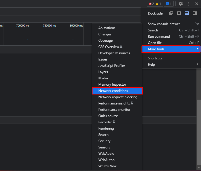 1. Открыть DevTools, кликнуть по трем вертикальным точкам справа наверху (Customize and control DevTools) –> More tools -> Network conditions