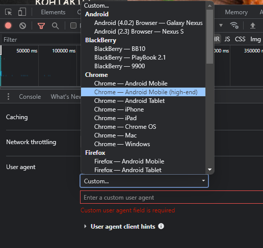 Вы также можете задать свой собственный произвольный user agent. Для этого выберите в списке выберите опцию «Custom» (самая верхняя позиция списка) и в поле ниже введите нужное значение.