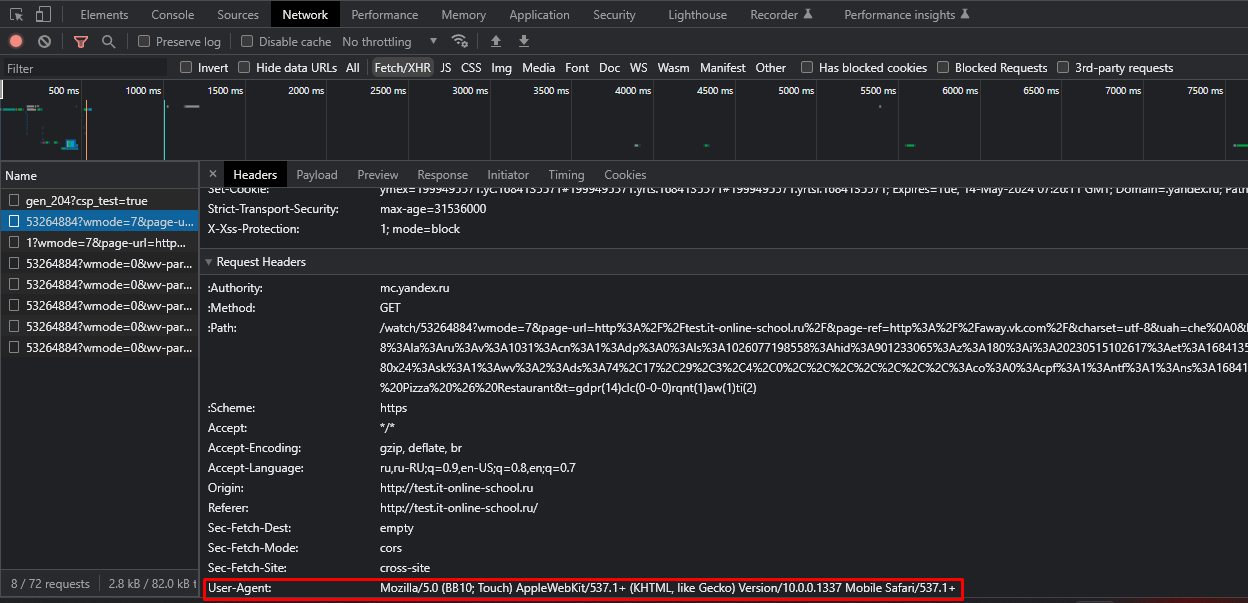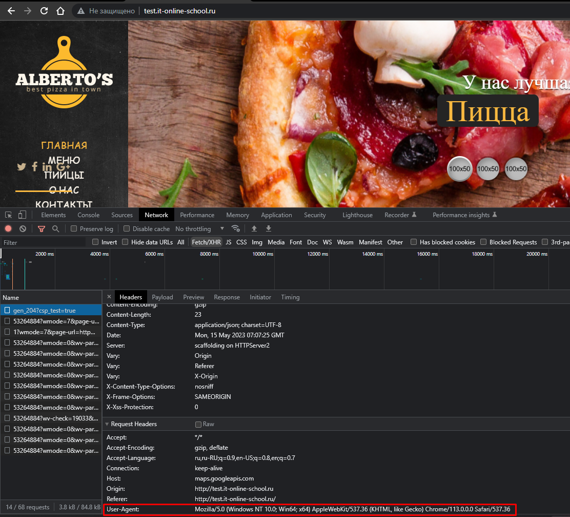 4. Теперь в отправляемом заголовке отражен выбранный user agent: